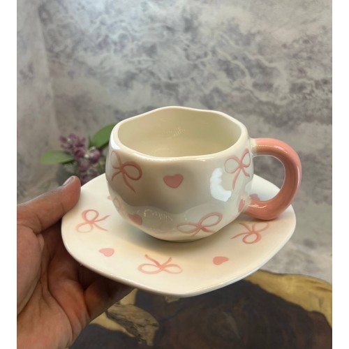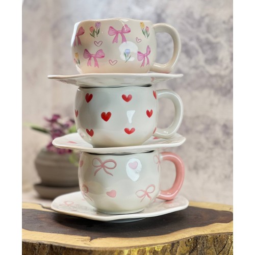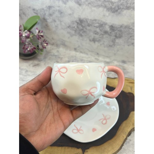 الوصف النوع: طقم كوب مع صحن تقديم متطابق. الخامة: سيراميك عالي الجودة بملمس ناعم. التصميم: زخارف يدوية (قلوب وفيونكات) بنمط عصري. الشكل: حواف انسيابية غير منتظمة لمظهر فني فريد. الاستخدام: مناسب للمشروبات الساخنة (قهوة، شاي، كابتشينو). العناية: آمن للاستخدام في غسالة الأطباق والميكروويف. الميزة: مقبض مريح وتصميم يجمع بين العملية والجمال.