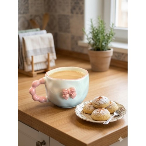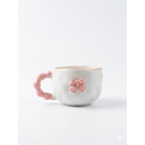 أضيفي لمسة من الرقة والأنوثة إلى روتينك اليومي مع هذا الفنجان السيراميك الفريد. يتميز بتصميمه العصري "المتموج" مع فيونكة وردية تضفي سحراً خاصاً، ومقبض مريح بتصميم لؤلؤي جذاب. ????☕