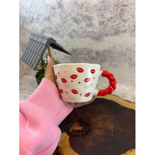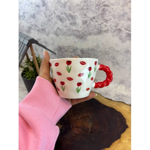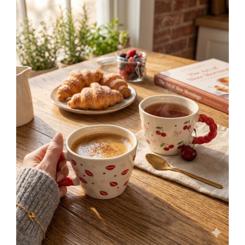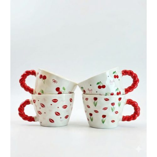 ابدئي يومك بلمسة من الحيوية والكثير من الحب! مجموعة أكواب السيراميك ذات المقبض الملتوِ الأحمر تركز على التفاصيل التي تصنع الفارق—بداية من النقوش الرقيقة المرسومة يدوياً وحتى المقابض الحمراء الجذابة. سواء كنتِ تفضلين نقشة "القبلات" الرومانسية أو نقشة "الكرز" المبهجة، هذه الأكواب ستحول استراحة القهوة إلى لحظة احتفال. امزجي بين تصاميمك المفضلة لتشكيل طقم ضيافة عصري وأنيق.