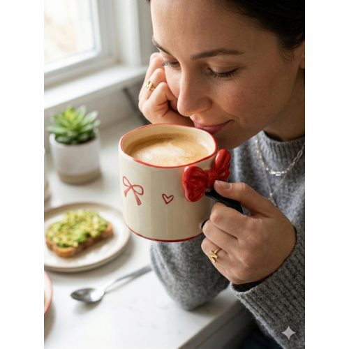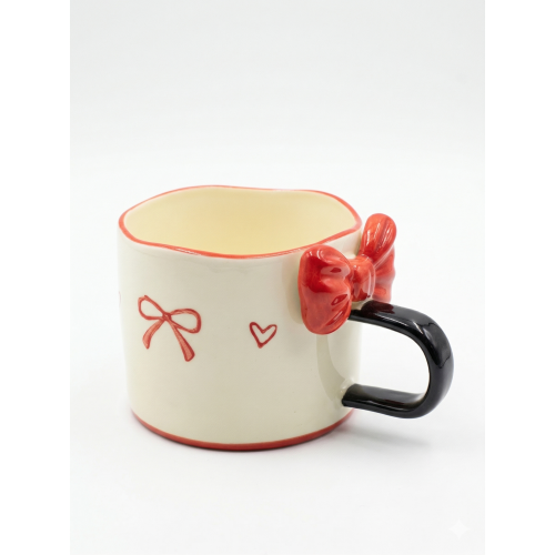 أضيفي لمسة من الأناقة والدفء لقهوتك الصباحية مع هذا الماجم السيراميك ذو التصميم الفريد. يتميز بفيونكة حمراء مجسمة على اليد وتفاصيل رقيقة مرسومة يدوياً لقلوب وفيونكات، مما يجعله مزيجاً مثالياً بين الرقة والرقي. مصنوع من بورسلين عالي الجودة بلمسة ناعمة، ليكون هدية مثالية أو إضافة رائعة لمجموعتك الخاصة في المطبخ.