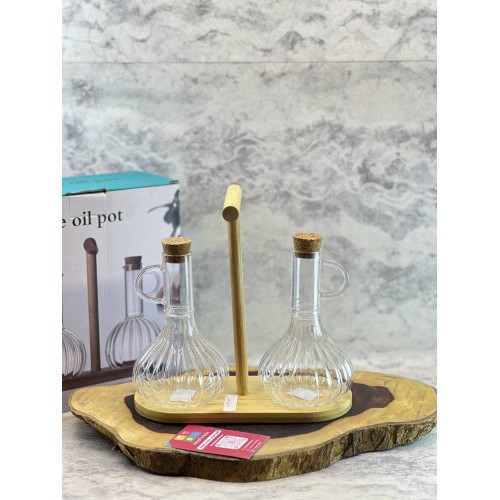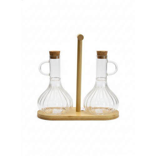 طقم زيت وخل بايركس نقي مع حامل خشب بامبو طبيعي مقاوم للمياه تماماً، وغطاء فلين بيقفل بإحكام ويضيف لمسة "مودرن". يعني نظافة، شياكة، وعملية في قطعة واحدة!