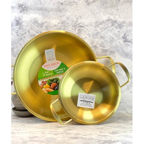 | الوصف | العلامة التجارية: رايلامون (Raylamon). المادة: ستانلس ستيل (فولاذ مقاوم للصدأ) عالي الجودة. اللون: ذهبي ملكي بلمعة المرآة (Mirror Polish). المقاس: 24 سم (القطر). نوع المقابض: مقابض مزدوجة قوية ومثبتة ببراغي تدعيم لضمان الأمان أثناء الحمل. الاستخدام: متعدد الاستخدامات (للقلي، التقليب السريع "Wok"، أو لتقديم الطعام مباشرة على السفرة). المميزات: توزيع حراري سريع ومتساوي لطهي احترافي. مقاوم للصدأ والخدش ولا يتفاعل مع الأطعمة. تصميم عصري يضيف فخامة لديكور المطبخ. |