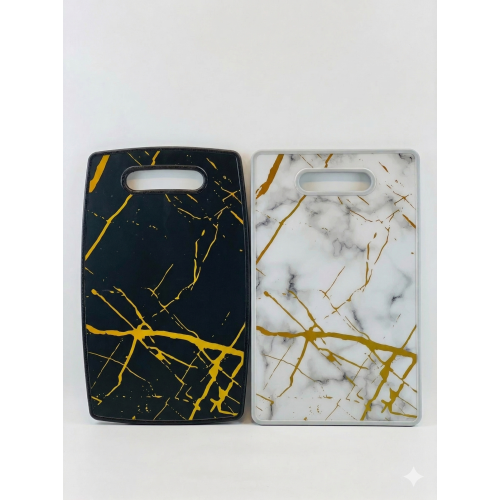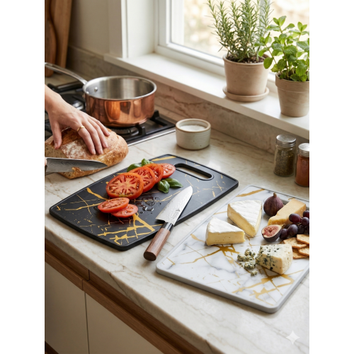 أضيفي لمسة عصرية وعملية إلى مطبخك مع ألواح التقطيع الفاخرة بتصميم الرخام الإيطالي. متوفرة باللونين الأبيض الكلاسيكي والأسود الملكي مع عروق ذهبية جذابة، لتجمع بين المتانة والشكل الجمالي الذي يزين سطح مطبخك.