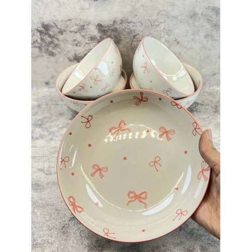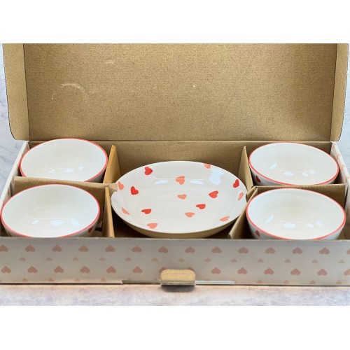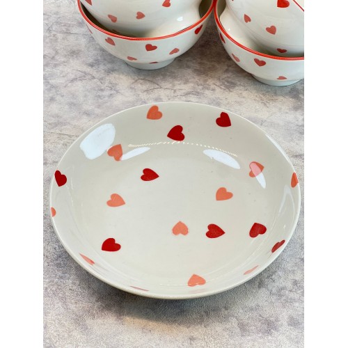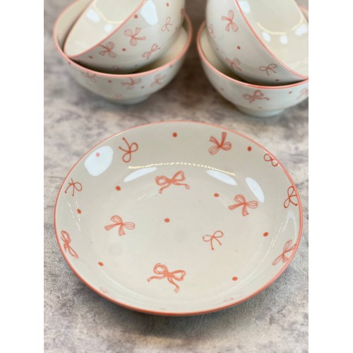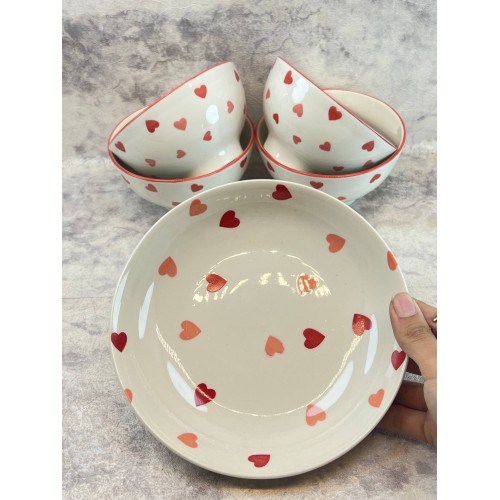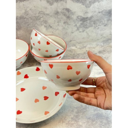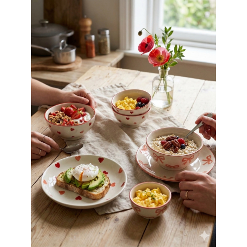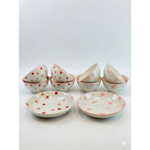 اجعلي أوقات الوجبات أكثر بهجة مع طقم الأطباق والبولات المزين بنقوش القلوب والفيونكات الرقيقة. يتميز هذا الطقم بتصميمه العصري وألوانه الهادئة، مما يجعله مثاليًا لتقديم الحساء، الحبوب، أو الوجبات الخفيفة بلمسة جمالية فريدة.