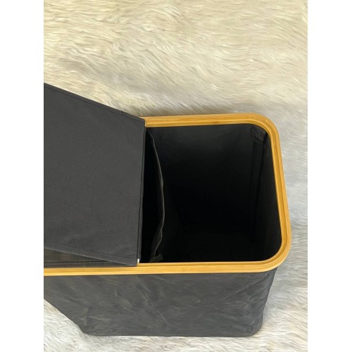 أناقة التنظيم في منزلك. ارتقِ بمستوى الترتيب في منزلك مع سلة الغسيل العصرية والعملية. بفضل تصميمها الذي يجمع بين القماش الأسود المتين وإطار الخشب الطبيعي (البامبو)، تمنحك هذه السلة لمسة جمالية بسيطة تناسب تماماً الحمام، غرفة النوم، أو غرفة الغسيل.
