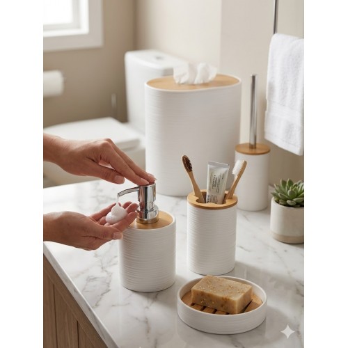 طقم إكسسوارات الحمام الملكي - سيراميك مضلع مع خشب البامبو (6 قطع)