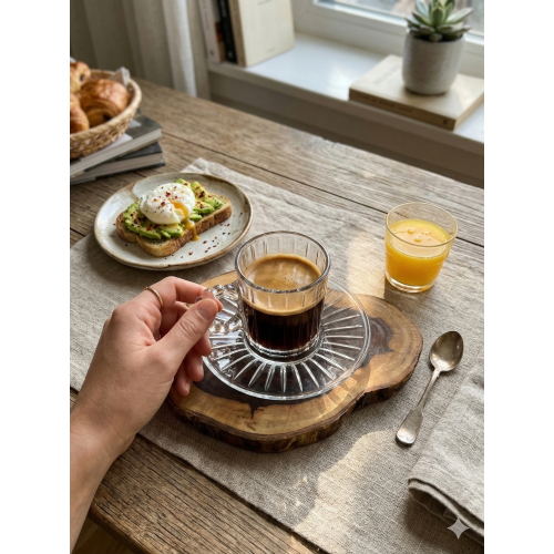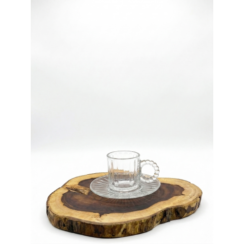 ابدأ صباحك بلمسة من الرقي والشفافية. يتميز فنجان القهوة هذا بتصميم مضلع فريد مع يد "لولي" أنيقة، ويأتي مع طبق زجاجي بتصميم شعاعي متناغم. سواء كنت تفضل الإسبريسو القوي أو القهوة التركية الكلاسيكية، يضفي هذا الطقم لمسة عصرية وفخمة على طقوس قهوتك اليومية.