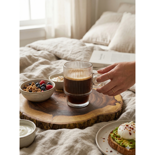 ارتقِ بتجربة شرب القهوة مع هذا الكوب الزجاجي المضلع المستوحى من التصاميم الهندسية الراقية. يتميز الكوب بتصميم متدرج فريد ويد مربعة جريئة، مما يمزج بين سحر التصاميم الكلاسيكية والبساطة العصرية. تضفي التضليعات الطولية لمسة جمالية تتلاعب بالضوء، مما يجعله الكوب المثالي لإبراز طبقات الإسبريسو أو الفلات وايت المفضلة لديك.
