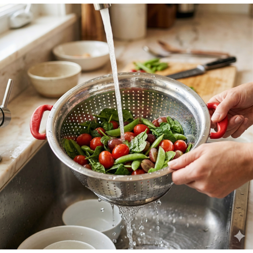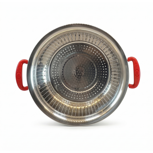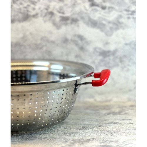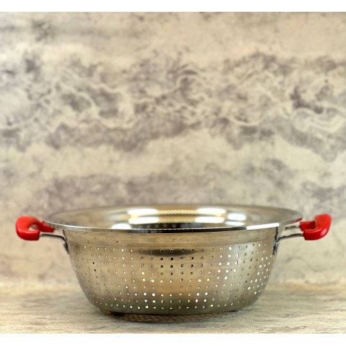 اجعل مهام المطبخ اليومية أسهل وأكثر أماناً مع هذه المصفاة المصنوعة من الفولاذ المقاوم للصدأ عالي الجودة. تتميز بتصميم متين مع مقابض حمراء عازلة للحرارة لضمان سهولة الحمل والتحكم، وهي مثالية لتصفية المعكرونة، غسل الخضروات، أو الفواكه بفعالية تامة.
