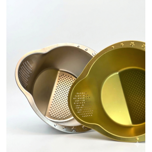 جم المطبخ الجديد وصل وعاء غسيل وتصفية الأرز والخضروات الذكي، مصنوع من الفولاذ المقاوم للصدأ (SUS 304) عالي الجودة بلون ذهبي فاخر. بتصميم ذكي يجمع بين الغسيل والتصفية في قطعة واحدة، مع قاعدة بارزة لضمان تنظيف مثالي وسهولة في صب المياه. قطعة تجمع بين الأناقة والعملية لتوفير وقتك ومجهودك