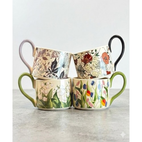 استمتعي بلمسة من الطبيعة في كل رشفة! ???? طقم مجات سيراميك بتصميمات زهرية كلاسيكية وألوان مريحة للعين، تجمع بين الفخامة والبساطة. كل مج يحكي قصة بجمال ألوانه وتفاصيله الدقيقة، مع يد ملونة تضيف لمسة عصرية. مثالي لقهوة الصباح أو لإضافة لمسة جمالية لمطبخك.