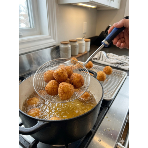 خليكي ملكة في مطبخك مع مصفاة القلي الاستانلس ستيل (السبايدر). بتصميمها الذكي ويدها الطويلة المقاومة للحرارة، هتقدري ترفعي البطاطس، المكرونة، أو الزلابية من الزيت أو الماية المغلية بكل أمان ومن غير قلق. عملية، خفيفة، وسهلة جداً في التنظيف!